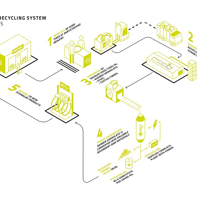 So funktioniert die Prozesskette: Altreifen werden durch ein Pyrolyseverfahren thermisch zerlegt. Das funktioniert ohne Sauerstoff und somit wird nichts verbrannt und keine Emissionen ausgestoßen. Der dabei entstehende Dampf kondensiert zu hochwertigem Öl, das von der Industrie als Rohölersatz abgenommen wird. Das Gas treibt die Anlage an, die dadurch energieautark läuft. Und vor allem: Der aus der Pyrolyse gewonnene Ruß bzw. Recovered Carbon Black (rCB) wird von SCHWALBE in Neureifen eingesetzt.